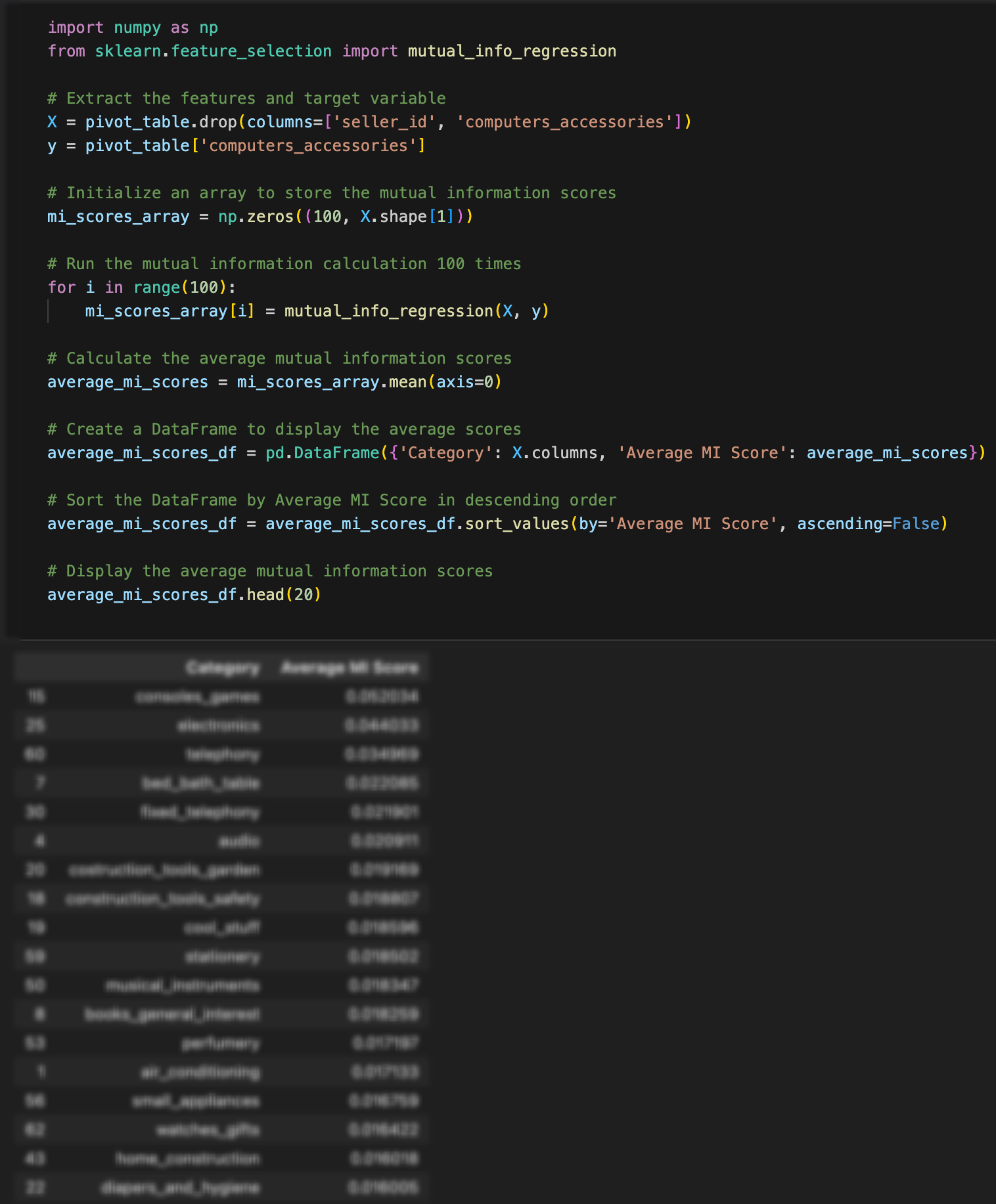 그래서 회귀분석 방법 중 상호 정보량을 활용하여 두 연속형 변수 간의 비선형 관계를 분석하는 상호 회귀 분석 기법을 통해 이들이 다루는 카테고리와 가장 연관성이 높은 카테고리를 추려내는 과정을 진행했어요.