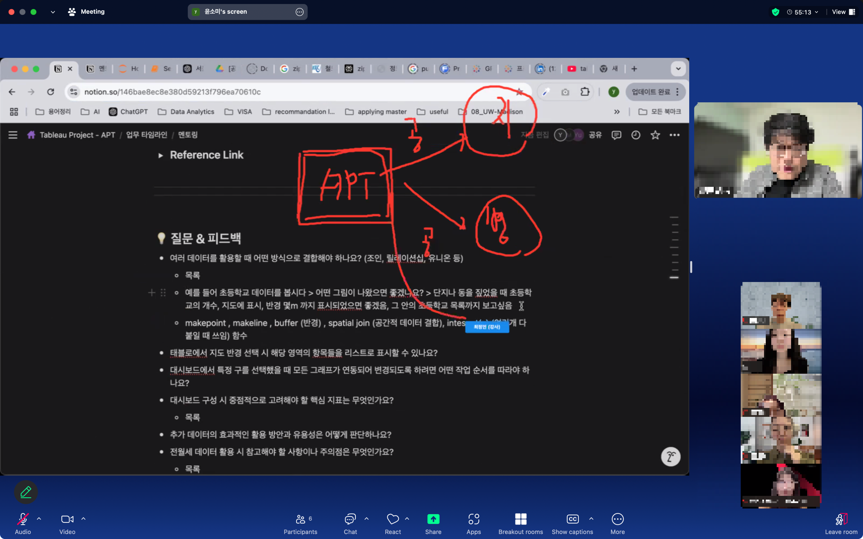 저희 팀은 4명으로 구성되었고 약 11일의 기간 동안 세번의 오프라인 미팅을 가졌습니다. 만나는 장소는 부동산 데이터 분석가 답게(?) 각자 서울에서 오기 적당한 위치인 공덕역의 어느 카페에 모여서 그룹 프로젝트를 진행했습니다. 이후에는 폭설로 인해 집에서 각자의 PC를 원격 제어까지 해가며 재택 회의를 진행했어요.