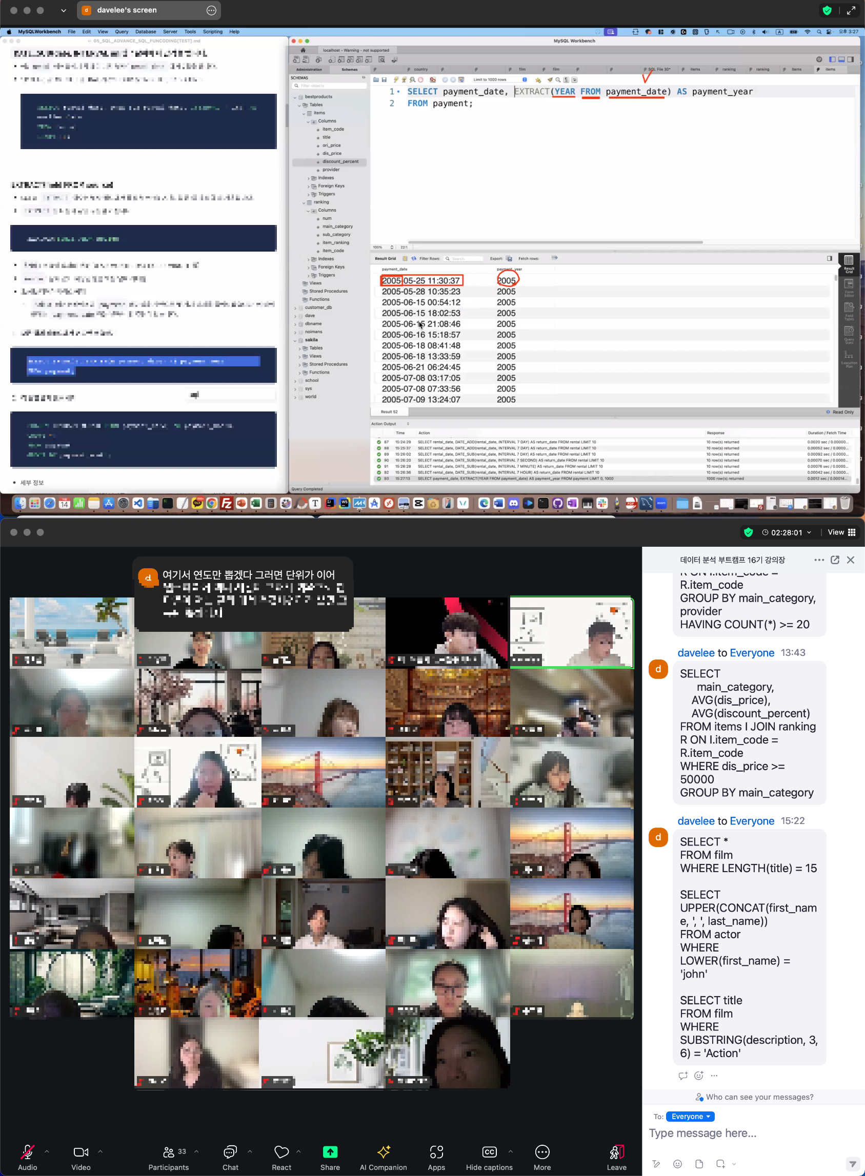 쿼리 작성에 익숙해지기까지 시간이 걸렸고, 특히 복잡한 JOIN과 서브쿼리는 이해하는 데 많은 연습이 필요했습니다. 하지만 익숙해지고 나니 데이터베이스를 직접 다룰 수 있다는 점에서 성취감이 컸어요. 만약 부트캠프를 준비하는 분이라면, 미리 SQL 기초를 익혀 두는 걸 추천합니다.
