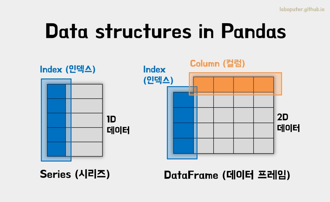 - Series : 1차원 데이터 셋 - 데이터(1개의 컬럼 값)와 인덱스로 구성