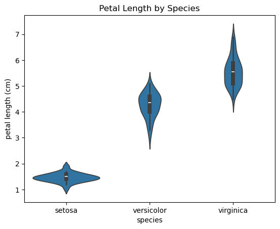 plt.title('Petal Length by Species')